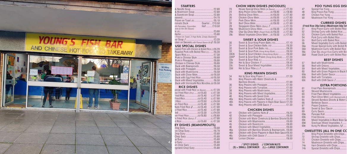 Young’s Fish Bar offers a diverse range of Chinese dishes along with a traditional fish and chips menu. It's a great spot for both lovers of Chinese takeout and classic British chippy fare.